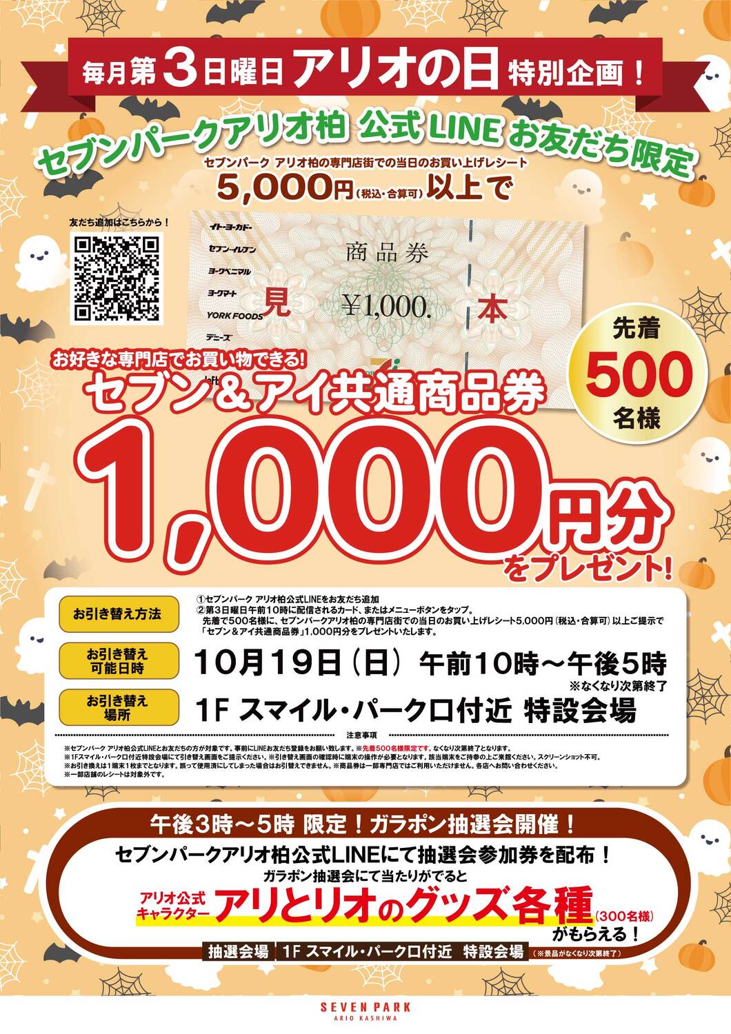 ※お引き替えは、当日のセブンパーク アリオ柏専門店街でのお買い上げレシート5,000円(税込・合算可)以上をご持参の上、セブンパークアリオ柏公式LINEより配信された引換画面を1Fスマイル・パーク口 付近 特設会場にてスタッフへご提示ください。