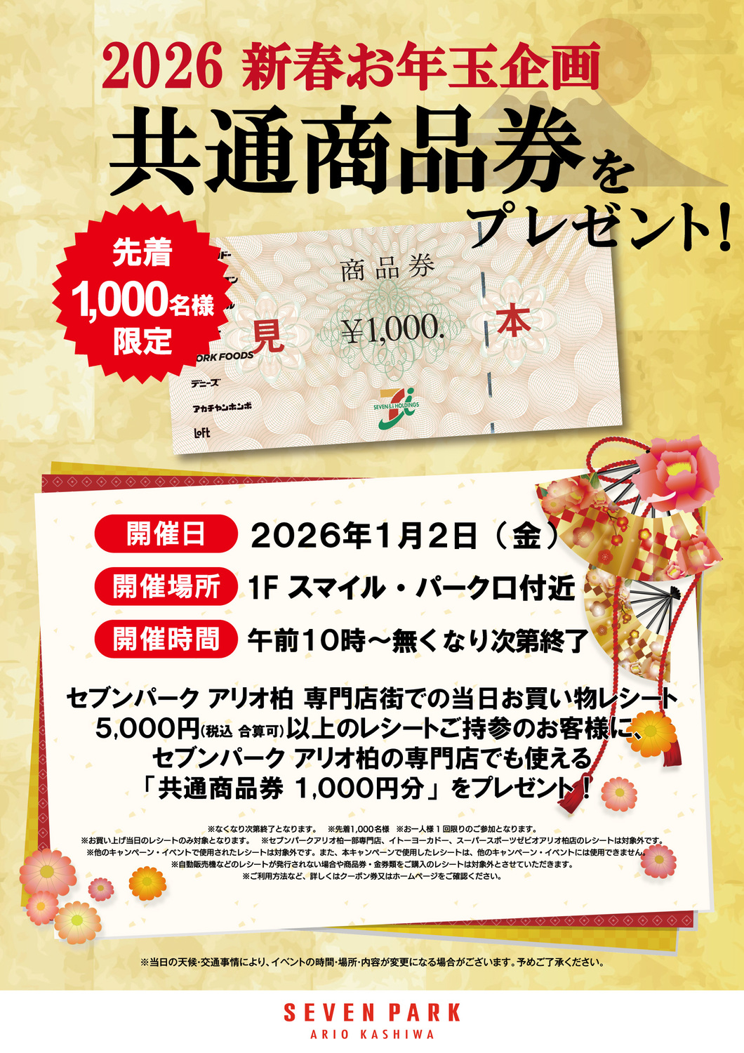 セブンパーク アリオ柏 専門店街での当日お買い物レシート5,000円以上(税込・合算可) をご持参のお客様に、セブンパーク アリオ柏の専門店でも使える「共通商品券 1,000円分」をプレゼントいたします!