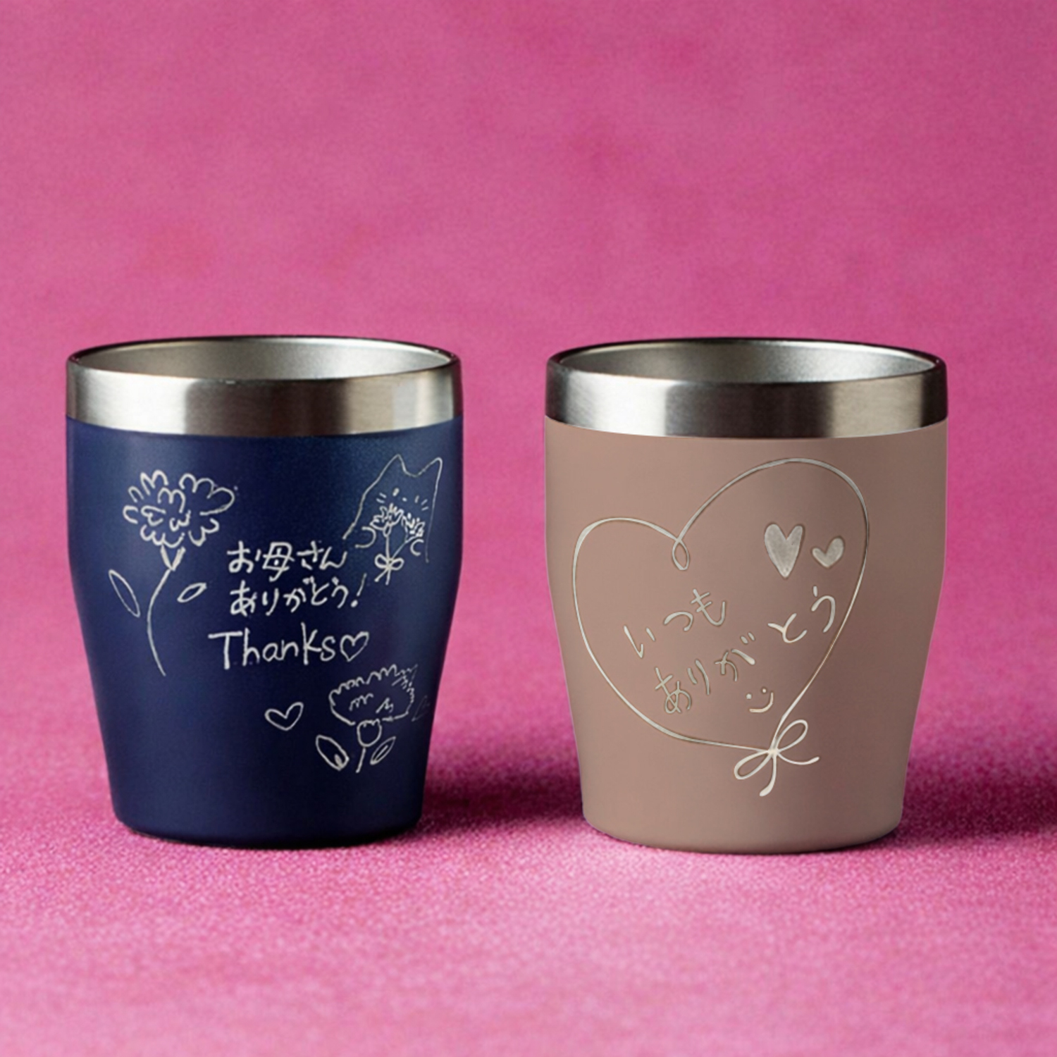 ステンレスタンブラーの表面に、イラストやメッセージを下書きし専用のルーターで下書き部分の表面を削りオリジナルデザインのタンブラーをお作りいただけます。