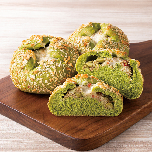 鉄分7.4mgの惣菜パン。3種の豆 (大豆・枝豆・インゲン豆)と豆乳のポテトサラダを、ほうれん草を練りこんだパン生地で包み、シュレッドチーズとパン粉をトッピングして焼き上げました。 忙しい日々を送る方へおすすめです。