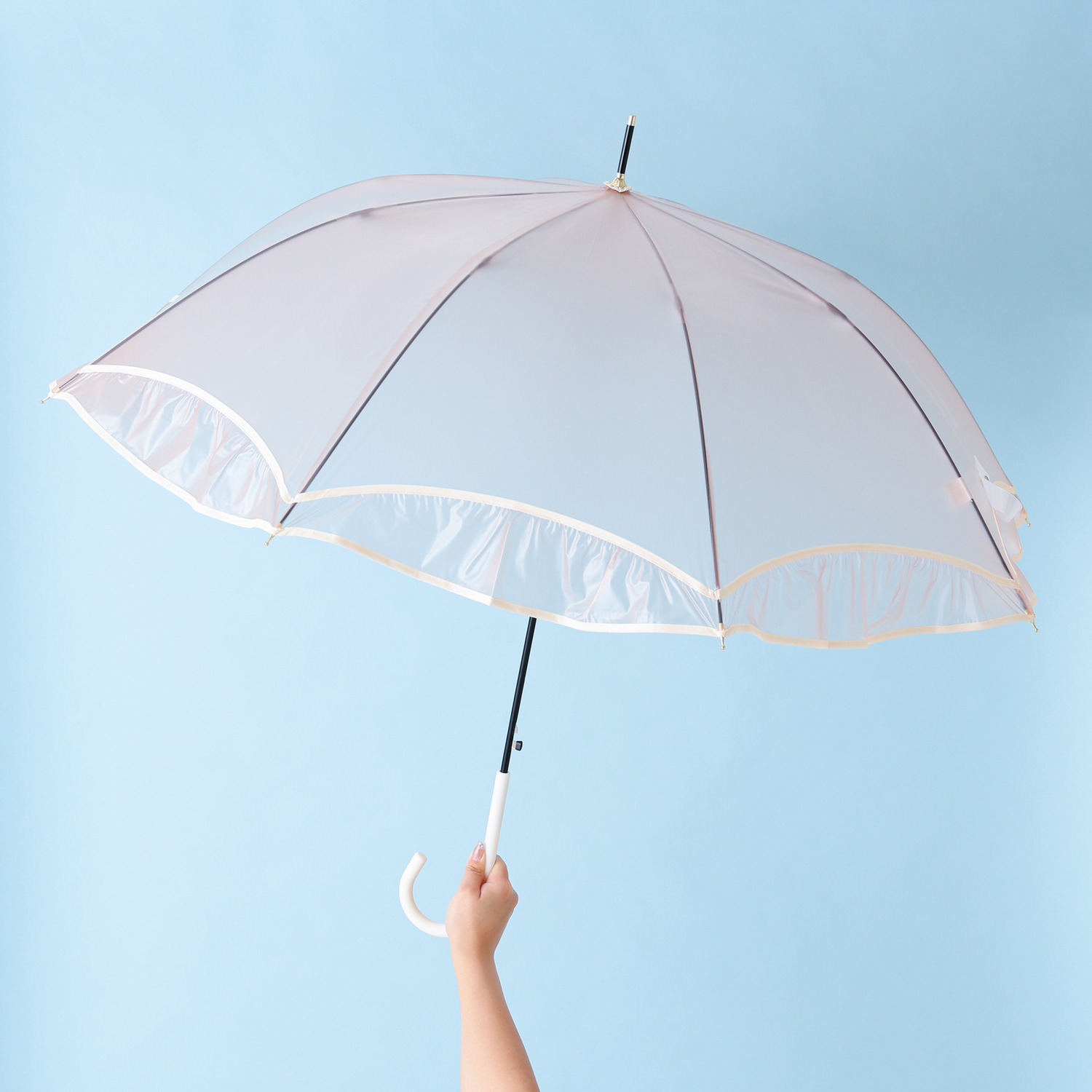 パイピングとふんわり透け感フリルを組み合わせた、シアー素材の長傘です。
